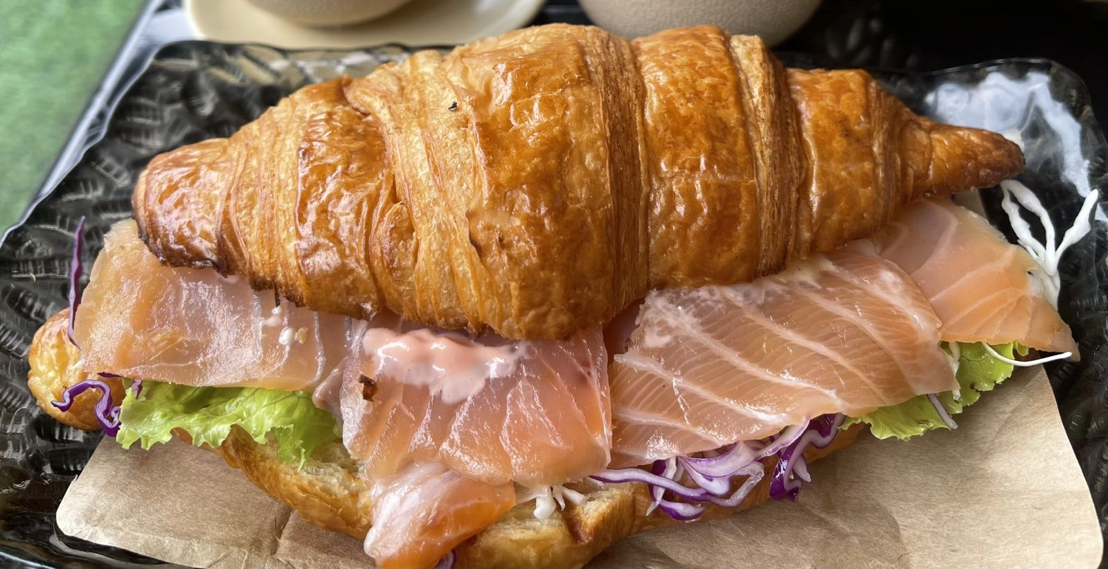 bánh croissant kẹp cá hồi xông khói,phô mai chua rau mùi ,salad và sốt mù tạt